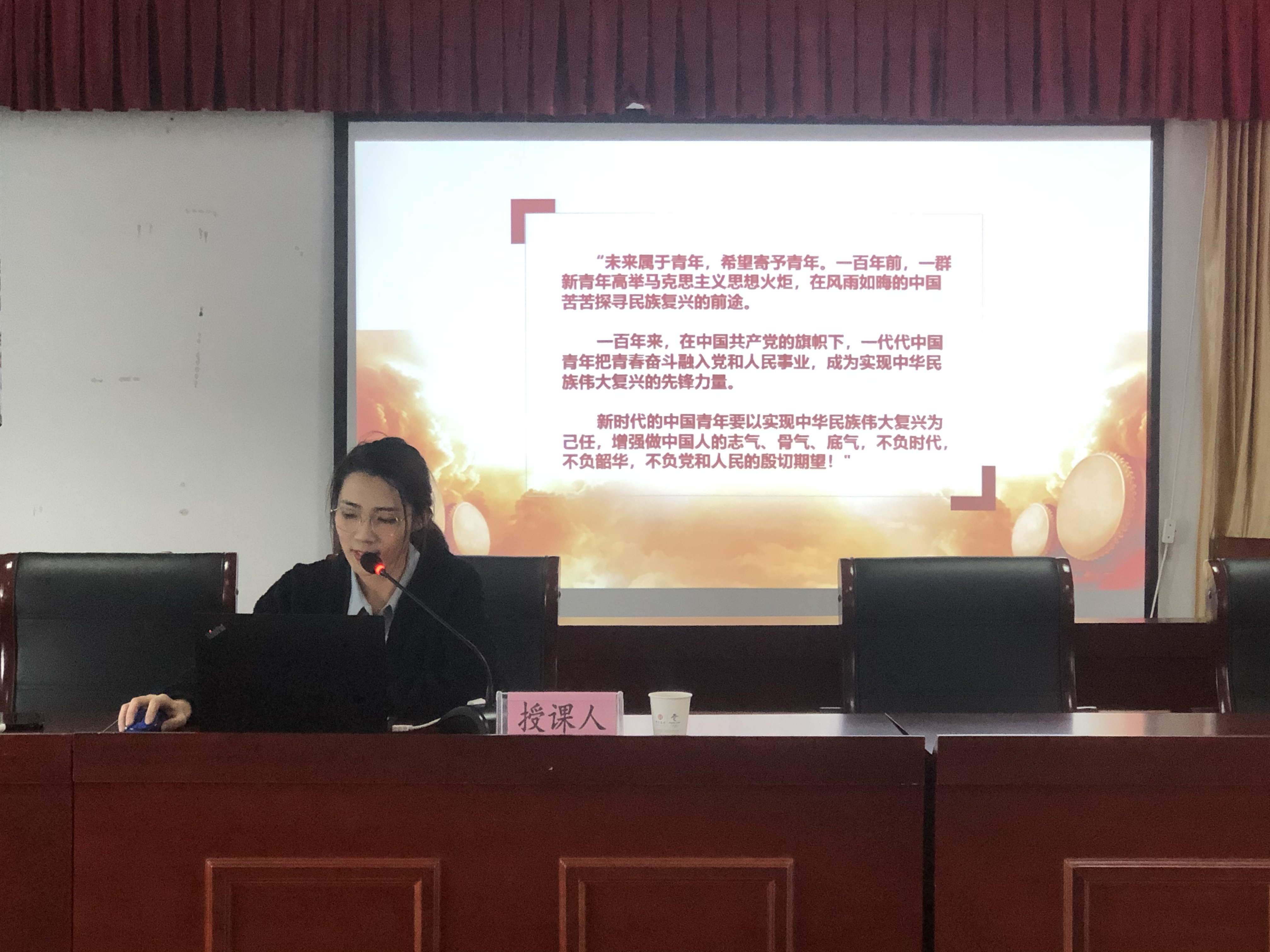 本次宣講以“百年恰是風(fēng)華正茂”為主題,圍繞習(xí)近平總書記在慶祝中國共產(chǎn)黨成立100周年大會上,對青年一代的充分肯定、殷切勉勵、深情寄語,從“不負(fù)時代,初心不改擔(dān)使命;不負(fù)韶華,心有所信方行遠(yuǎn);不負(fù)黨和人民的殷切期望,奮斗不止譜新篇”三個方面進(jìn)行深刻闡述。宣講會上,王迪通過視頻追尋革命先輩的光輝足跡。百年崢嶸歲月,眾多先輩不求顯達(dá)于世、不求暫得于己,不惜為了理想信念拋頭顱、灑熱血,用青春和生命書寫史詩。革命先輩們的事跡激勵我們,生逢盛世,作為新時代青年一代,要勇?lián)鷼v史使命,堅(jiān)定前進(jìn)信心,努力成為堪當(dāng)民族復(fù)興重任的時代新人!