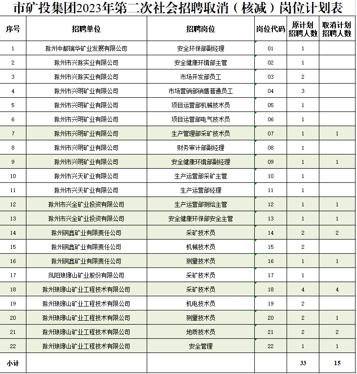 根據(jù)《滁州市興滁礦業(yè)投資集團(tuán)有限公司2023年第二次社會招聘公告》規(guī)定,經(jīng)對各崗位報(bào)名情況篩查審定,結(jié)合資格復(fù)審情況,部分崗位報(bào)名情況未達(dá)到開考比例,經(jīng)研究決定取消以下崗位招聘計(jì)劃: