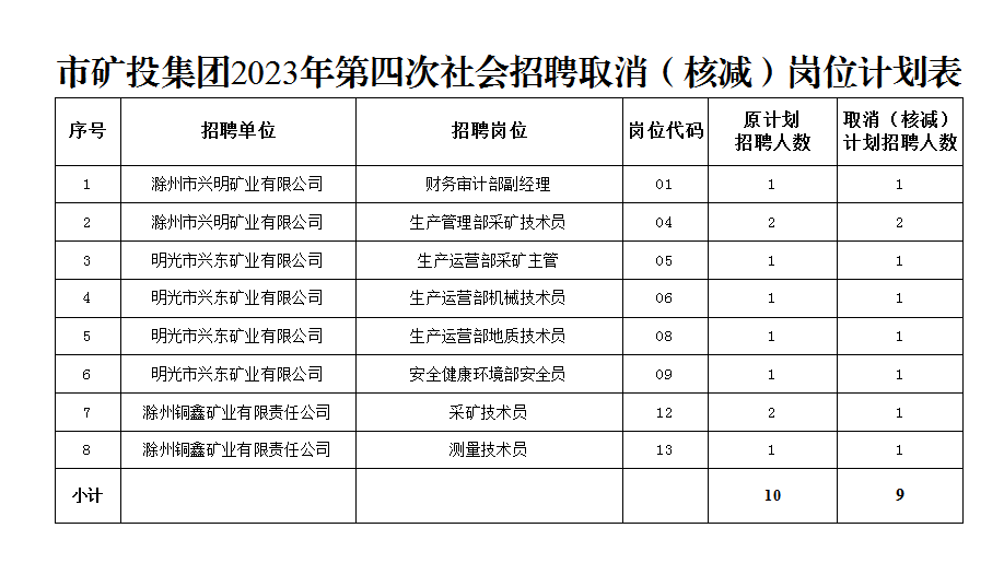 根據(jù)《滁州市興滁礦業(yè)投資集團(tuán)有限公司2023年第四次社會招聘公告》規(guī)定,經(jīng)對各崗位報名情況篩查審定,結(jié)合資格復(fù)審情況,部分崗位報名情況未達(dá)到開考比例,經(jīng)研究決定取消(核減)以下崗位招聘計(jì)劃:
