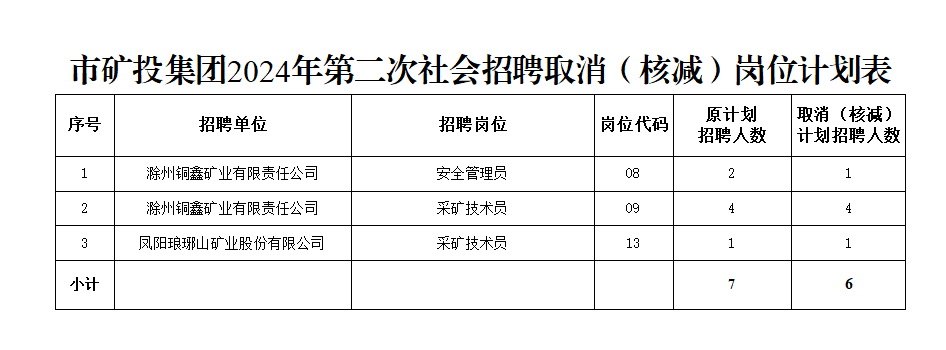 根據(jù)《滁州市興滁礦業(yè)投資集團有限公司2024年第二次社會招聘公告》規(guī)定,經(jīng)對各崗位報名情況篩查審定,結(jié)合資格復(fù)審情況,部分崗位報名情況未達到開考比例,經(jīng)研究決定取消(核減)以下崗位招聘計劃:
